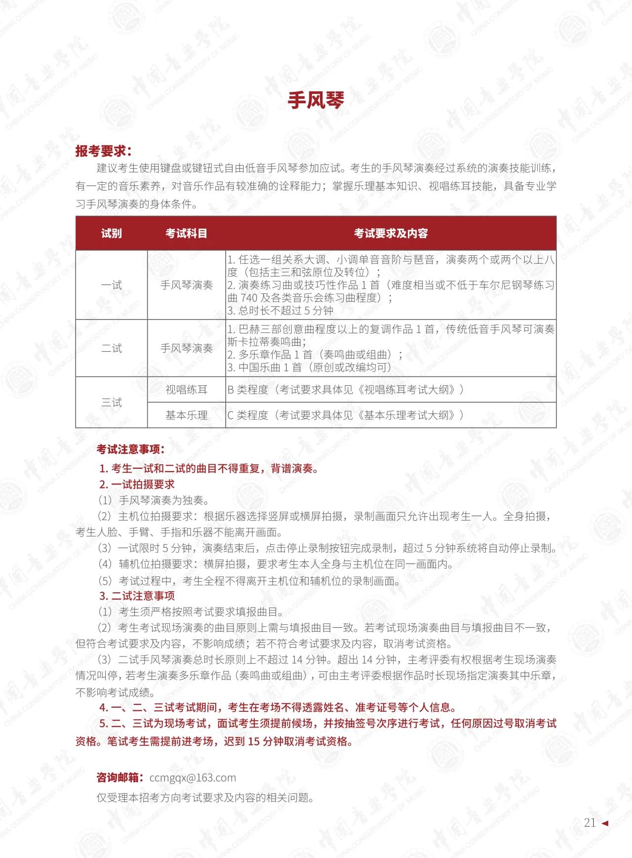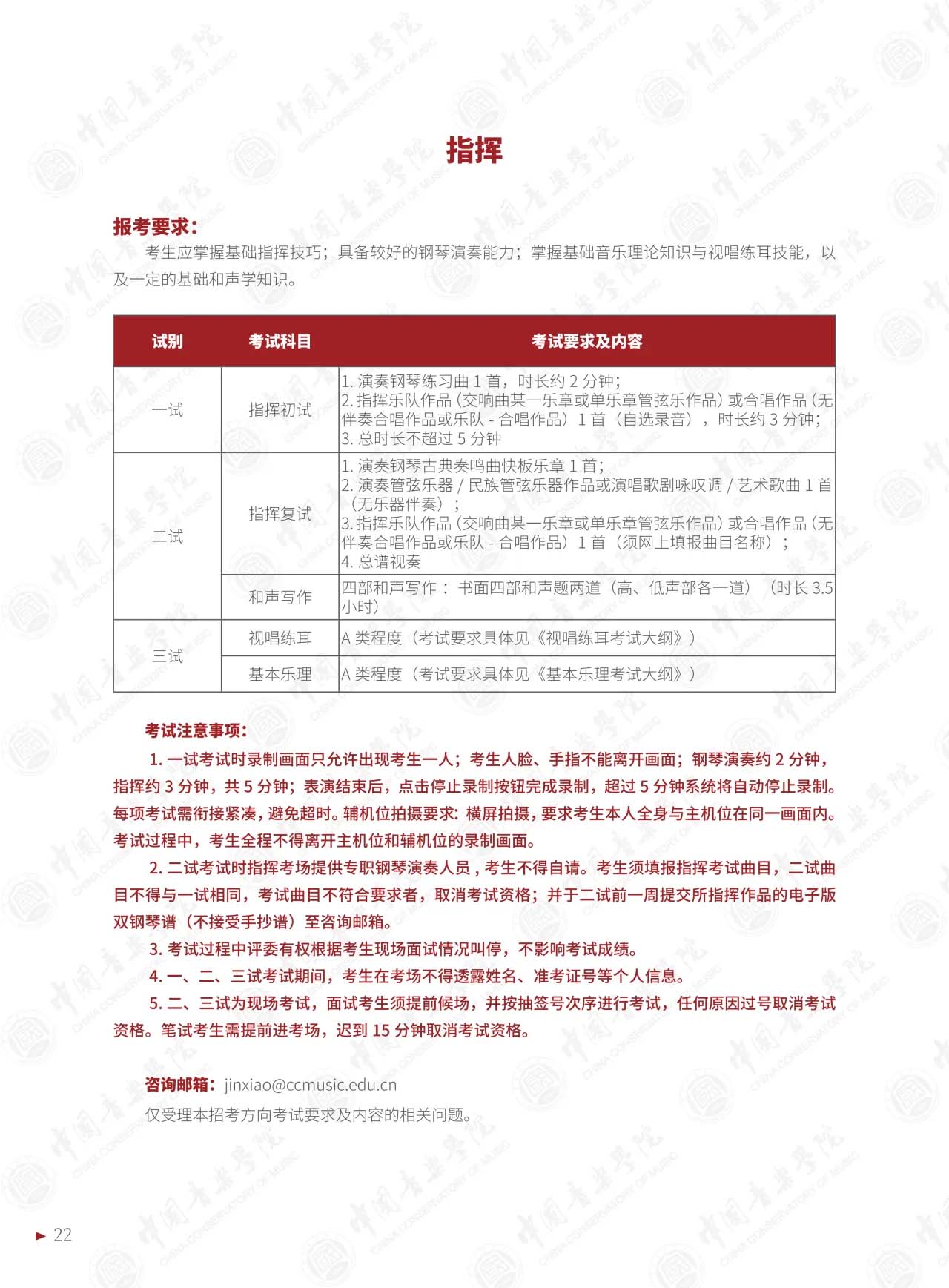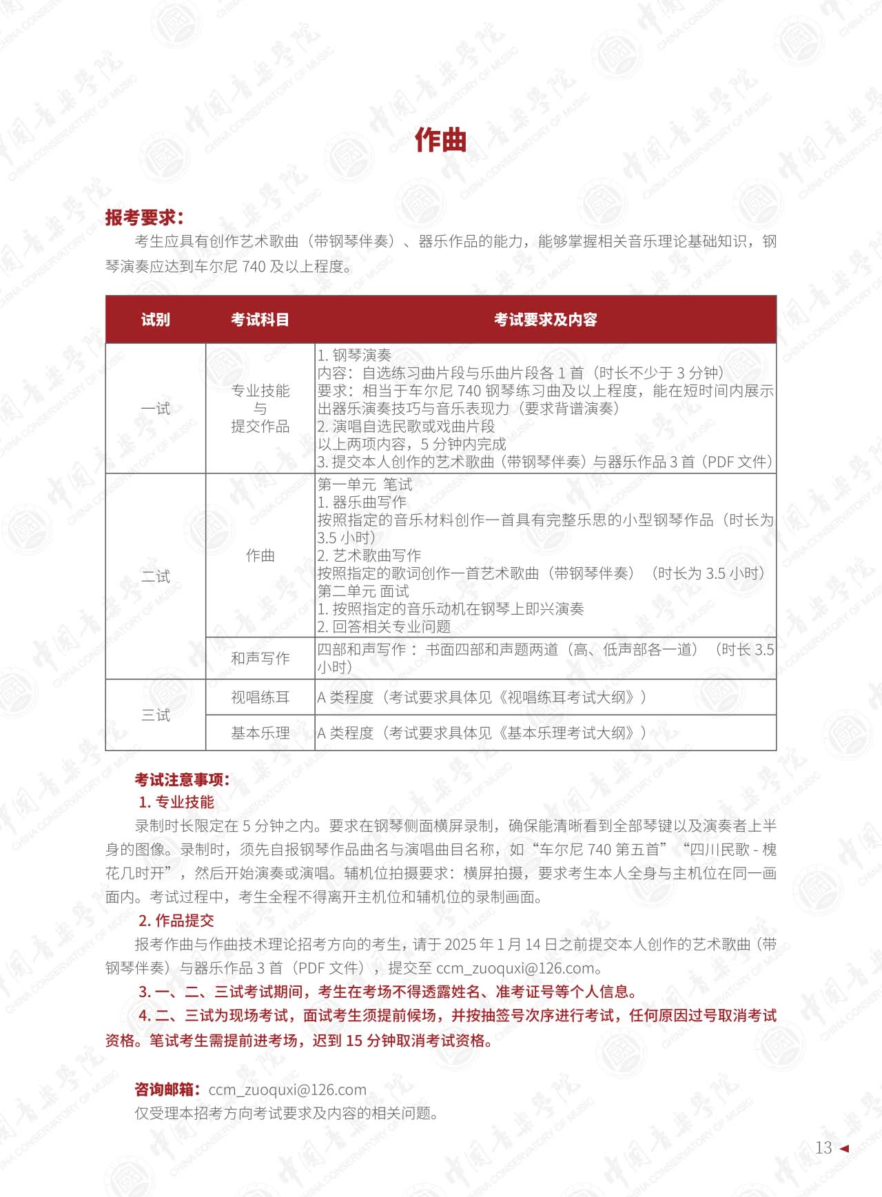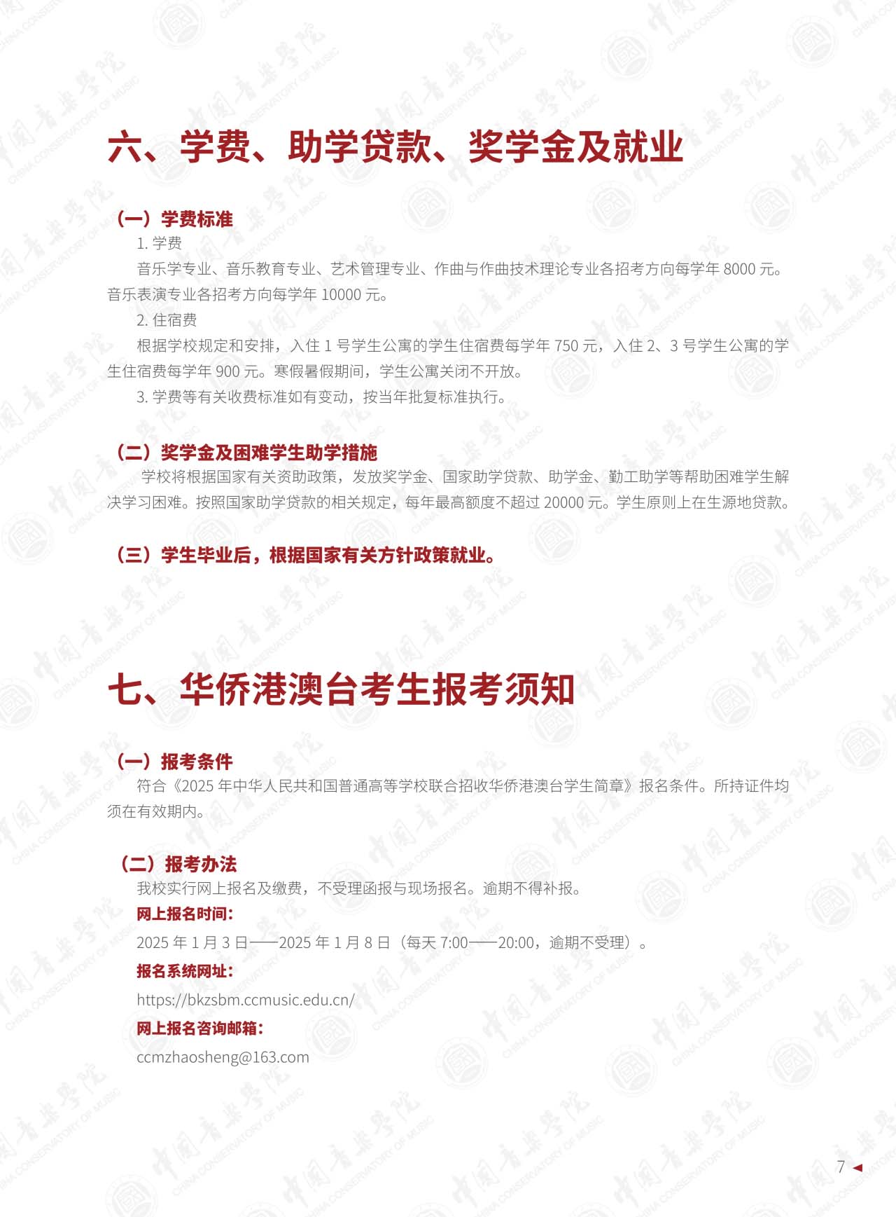 1. 每位考生只可选报1个专业方向。 2. 网上报名时间:2025年1月3日-1月8日(每日7:00-20:00)。 3. 线上初试时间:2025年1月11日-1月15日16:00pm。 4. 二、三试现场考试计划于2月中上旬展开。 6. 录取原则:所有专业采取文过专排形式录取,音乐生文化课须过生源所在省普本线,专业按校考排名择优录取。 7. 破格录取原则:作曲与作曲技术理论、音乐表演专业在名额未招满时,可触发破格录取;音乐学专业、音乐教育专业不执行破格录取。