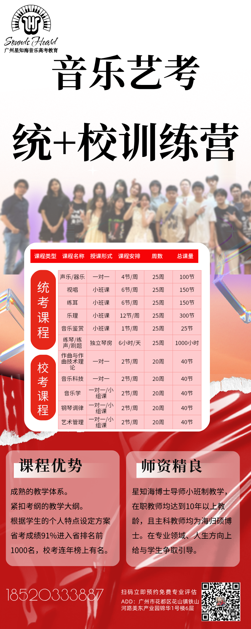 6个月的封闭式广州音乐艺考集训,10人伴读式小班学习,统考+校考同时备考,每周小测,每月观摩,掌握最新统考动向、各大院校校考动向,做到真正为每位学员量身定制备考、升学计划。