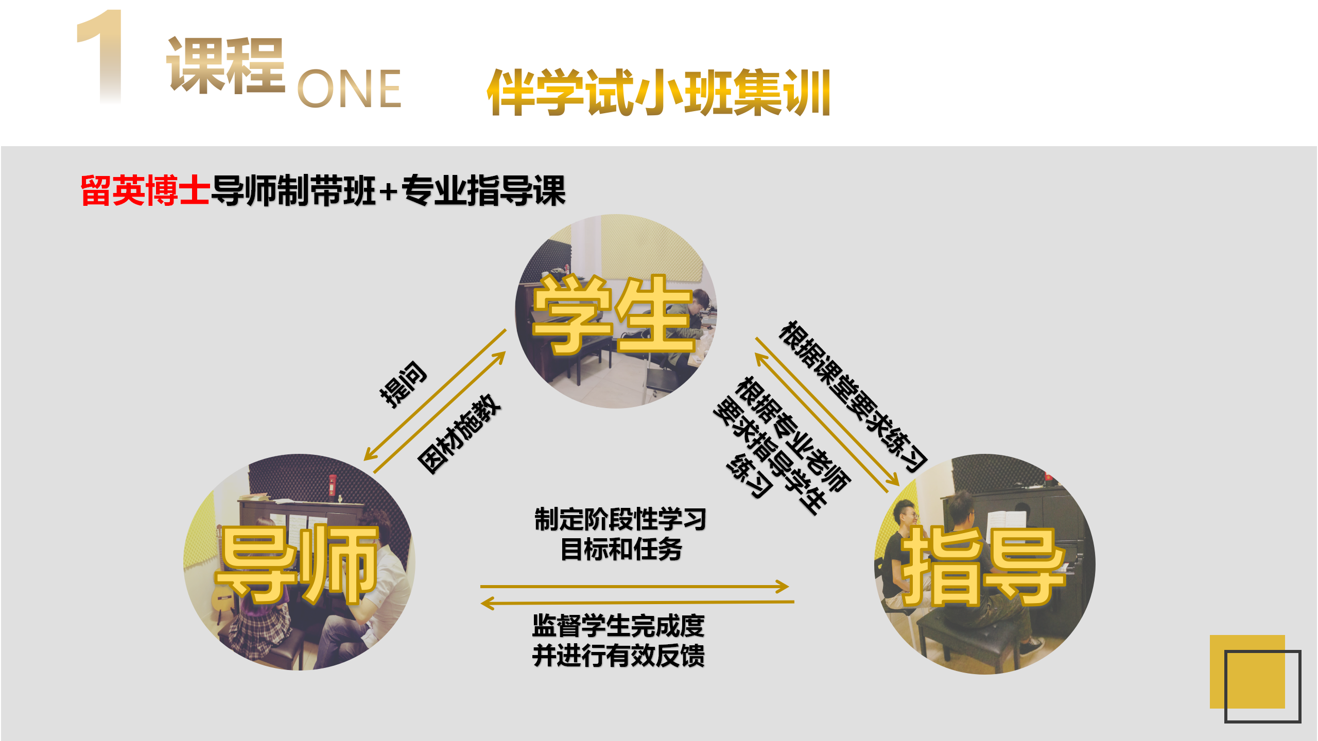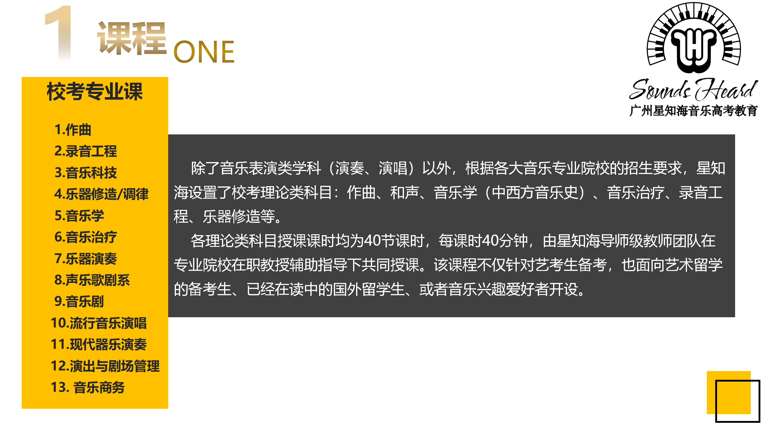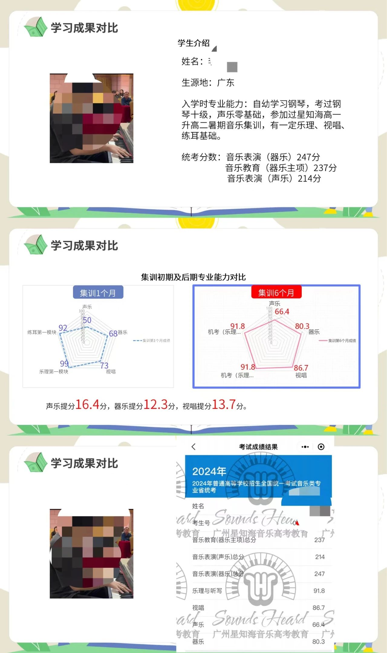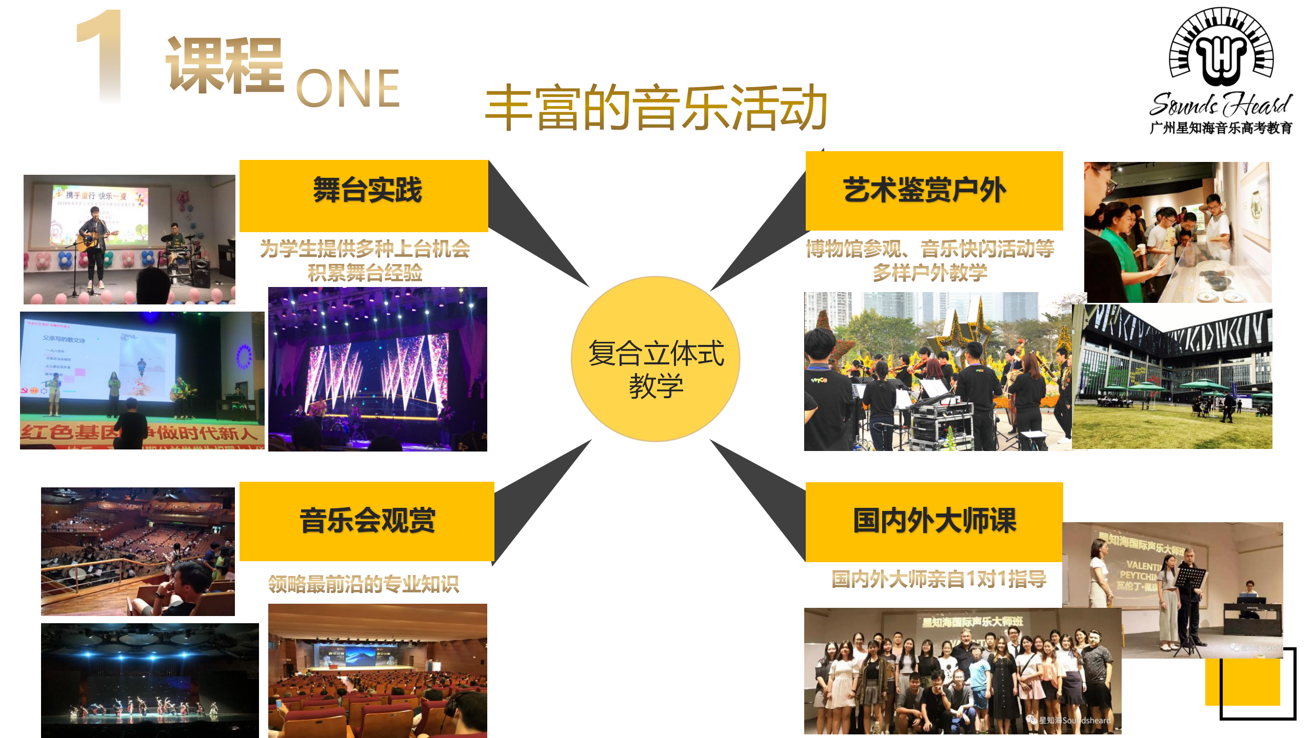 星知海实施 “统考+校考”集训课程,导师制小班教学的音乐艺考教育中心。 学员在入学前专业评估可得到个性化的课程规划;入学后由留英博士以伴读式系统教学法授课;考前冲刺辅导。整个教学过程中由导师带领的教师团队全方位引领学生保持在正确的轨道内备考。让学员体会到高质量、高强度、专业的教学和管理,让学生在专业领域、身心健康取得极大的发展,优质的教学环境,让学子们体验沉浸式艺考集训。 课程体系 01 入学专业评估 系统测试学生的基础乐科和专业课的入学成绩,为学生量身定制集训课程。 02 量身定制课程 结合学生志愿、实际水平,为学生定制校考目标,并在课程内设置校考专业课。统考+校考课程同时展开学习。 03 伴学试小班集训 根据学生个人特点因材施教,除1对1专业课外,另有1对1指导课加持,每阶段任务定制明确。老师与学生住同栋宿舍,与学生同吃同睡,24小时生活、学业关怀。 04 定期评测 每周周测、每月月考,每月定期组织观摩,让学生在刷题、密集式舞台表演、以及模拟考场各种意外场景中积累临场发挥能力,提高应考能力。 05 升学建议 学生生活状态、学习状态、心理状态每月将按照星知海独有的五边形数据采集系统整合后,每月定期发给家长。并根据考前定格状态给予个性化升学建议书。 06 带考服务 统考期间,广东省内学员享受大学城带考服务,由老师带领踩点考场、租赁考场附近琴房。 校考期间,学员享受每人免费1套校考录制服务。