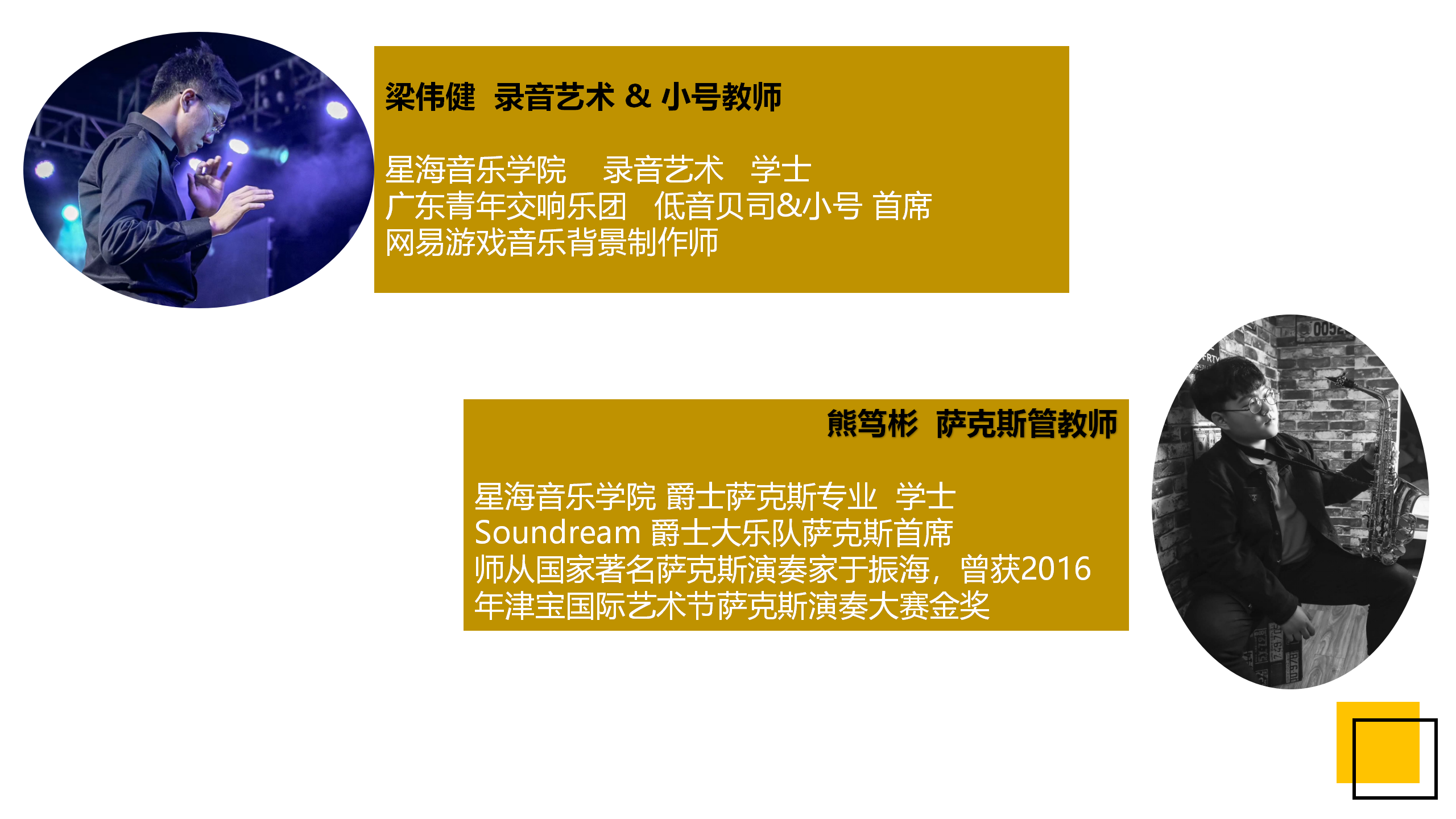全科导师-宋单 广州星知海音乐高考教育艺术教务总监 广东省流行音乐协会会员 全科目导师、钢琴专业主科老师、 乐理、练耳主科老师、作曲、音乐科技、音乐学专业老师 威尔士班戈艺术中心 课程导师 中国保利华亿传媒文化有限公司 音乐顾问 广州外语音像出版社《流行钢琴》主编 广州市流行音乐协会 会员 英国皇家北方音乐学院 作曲系 博士 英国威尔士班戈大学 作曲系 硕士 中央音乐学院 作曲系 硕士 星海音乐学院 作曲系 学士 星海音乐学院附中 作曲系